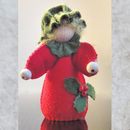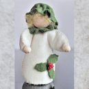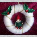 Een stryroporkrans van ca.15 cm omwikkeld met merinowol . In het midden zit een lief kerstkaboutertje en het is verder versiert met wat hulstblaadjes en gouden glitterlijm.
