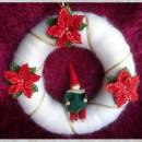 Een styroporkrans van 20 cm omwikkeld met merino wol. Er zitten 3 mooie vilten kerstrozen op en er zit een kerstkaboutertje in.