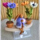 Een jaaring met 2 bloempotjes met bloemen en een schattig paashaasje. Alles is los te koop maar het geheel inlcusief de jaarring . Het paashaasje los is €10,00 en de bloemetjes in post los is €7,50 per stuk